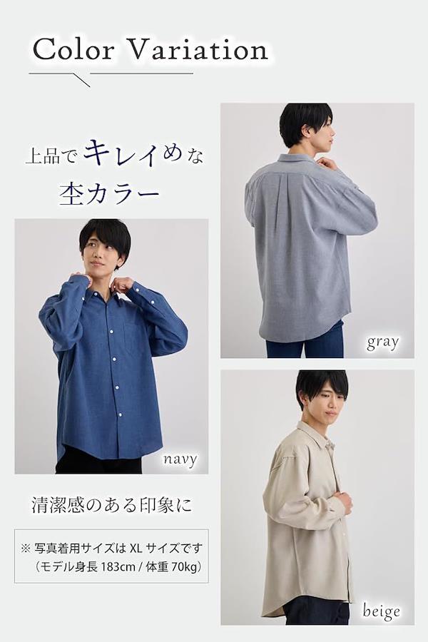 「上質感あふれる長袖メンズシャツ」リネンシャツのような生地感があり、その一方できちんと感と清潔感も兼ね備え、紳士服のように大人の雰囲気を引き立てます。