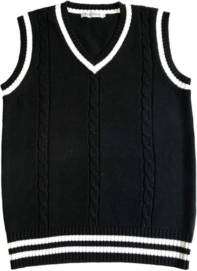 *カッチリしたスタイルでも、ラインの入ったニットベストがトレンド感のあるアクセントになります。