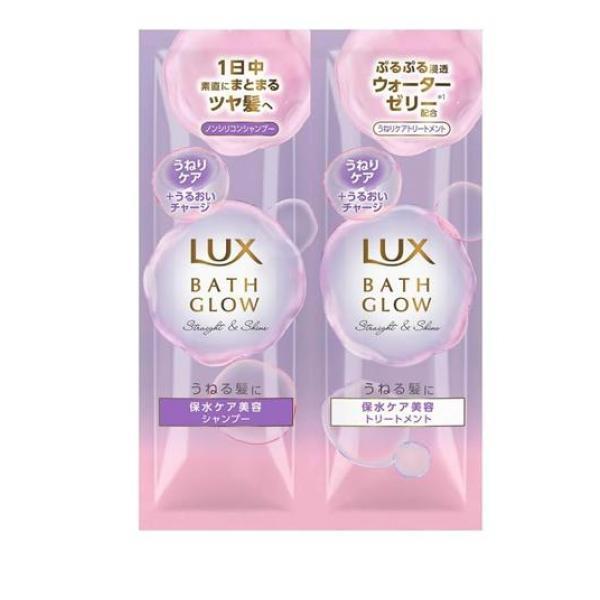 製品の特徴●LUX BATH GLOW Straight & Shine ラックス バスグロウ ストレートアンドシャイン シャンプー&トリートメント サシェセット●うねる髪に「うねりケア+うるおいチャージ」保水ケア美容シャンプー&トリートメントの1回分お試しサイズ(各10g)●朝、髪がまとまらない原因の1つは髪の水分不足。保水ケア美容で朝起きてから1日中素直にまとまるツヤ髪へ。●うねりが気になる方におすすめな、ストレート&シャイン。髪内部の水分の偏りを整え、自然なまとまりをキープ。●髪内部にとどまる、ぷるぷる浸透ウォーターゼリー(*1)配合。◇スイゼンジノリエキス:ヒアルロン酸の約5倍(*2)の保水力を持つ保湿成分。◇グリセリン水溶液:髪の芯まで浸透し、保湿。◇アルギニン:髪のダメージを集中補修・保湿。●水溶性加水分解ケラチン(*3)配合。●ダマスクローズ&カシスの華やかで上品な香り。●パラベン・合成着色料・シリコン無添加。●トラベルセット/旅行/お泊り/携帯用/ノンシリコン●販売名:ラックスBGSシャンプーB〈1回分〉10g●販売名:ラックスBGSヘアトリートメントB〈1回分〉10g