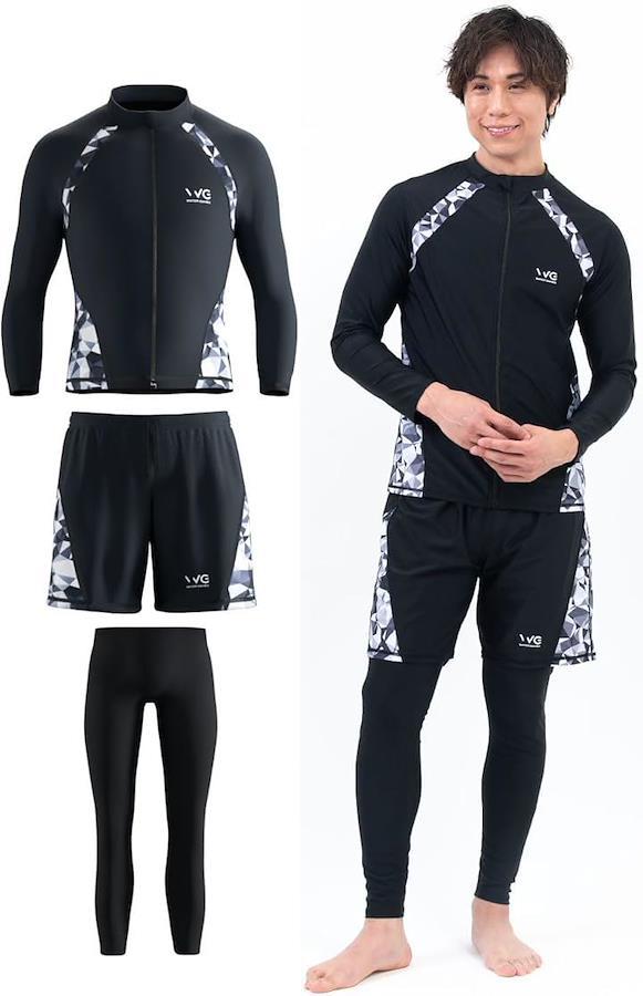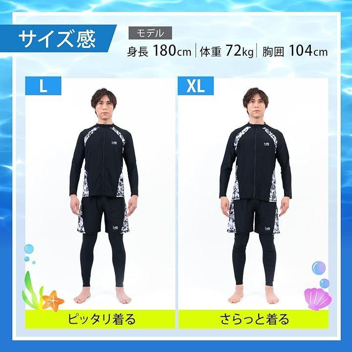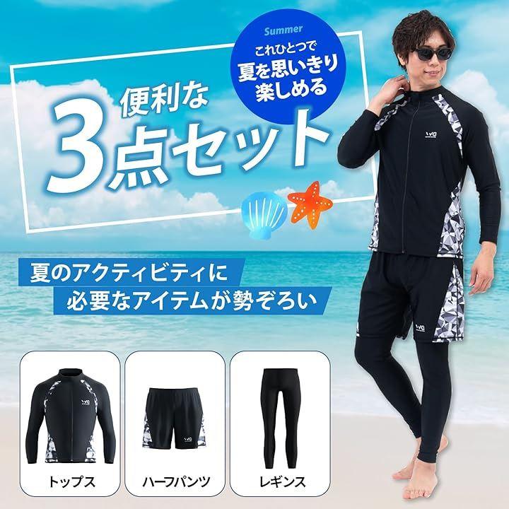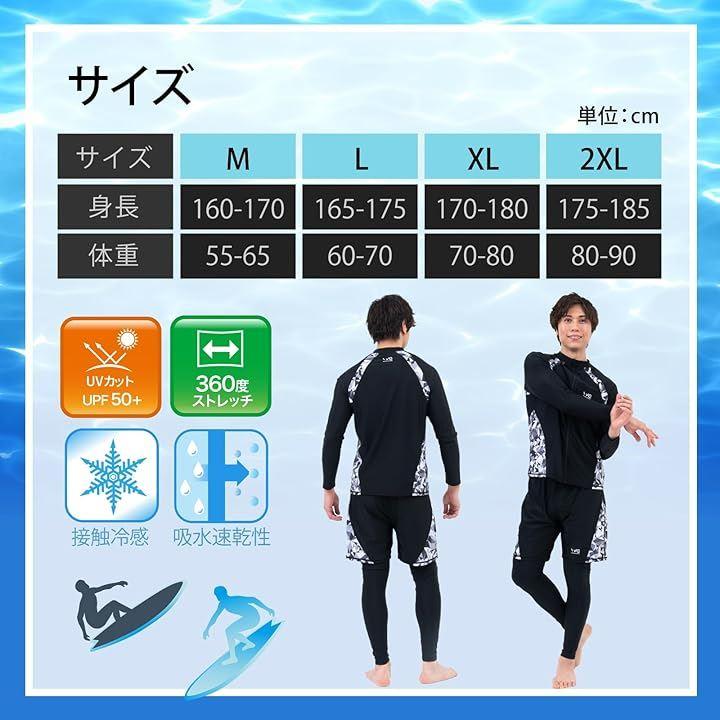 「セット内容&着用サイズ」長袖ラッシュガード、ハーフパンツ、レギンスの3点セット。