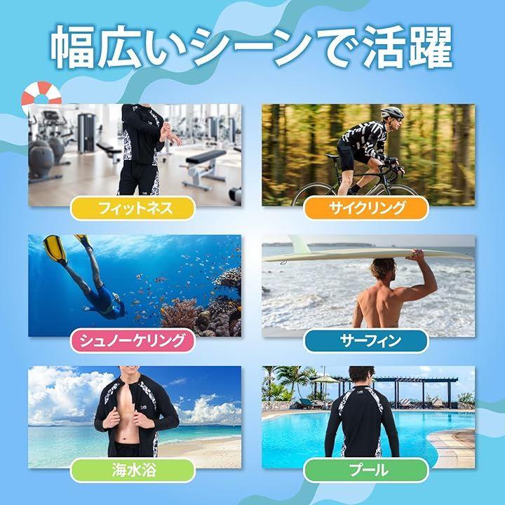 「水陸両用&幅広いシーンで活躍」吸汗・速乾素材で、スポーツやフィットネス、サイクリング、スイミング、サーフィン、ダイビング、海水浴、プール、ビーチ、温泉など幅広いシーンで使用可能。