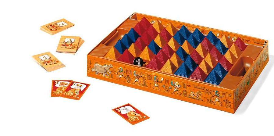 [セット内容]ピラミッド×47個 (金×16個,赤×16個, 青×15個) 探索カード×30枚 48個の穴が空いた盤面×1個 宝物タイル×12枚 (3カ所が空白で1カ所に宝物) チップ×21枚 (甲虫石×5枚、ミイラ×3枚、 1~3の探検家の帽子×13枚) ミイラ×1体
