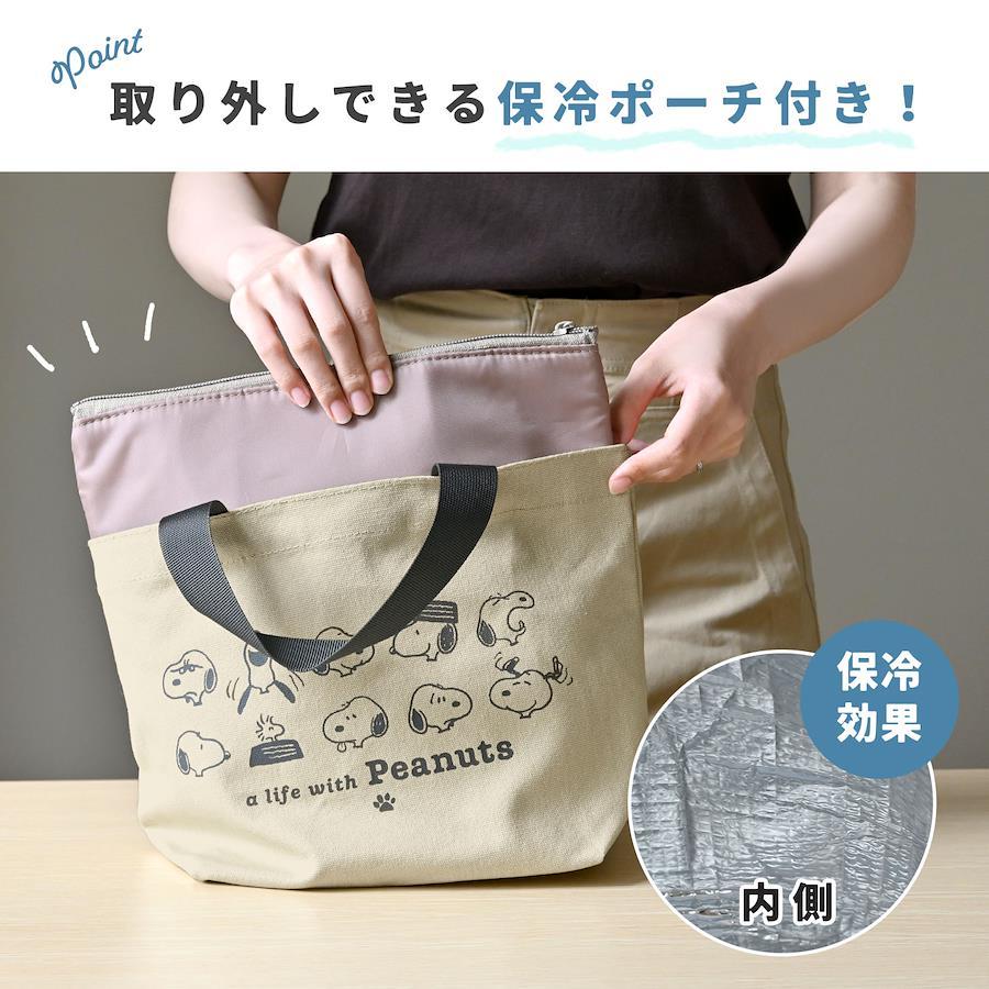 スヌーピーと仲間たちのデザインが可愛い!取り外しできる保冷ポーチが便利なランチトート。バッグと保冷ポーチが分かれているのでバッグ自体が汚れにくく、お弁当や保冷剤と濡らしたくない荷物が分けて入れられます。保冷ポーチの中には保冷剤用のメッシュポケット付きで暑い季節も安心!お揃い柄のランチアイテムとセットで使ってもかわいいです◎