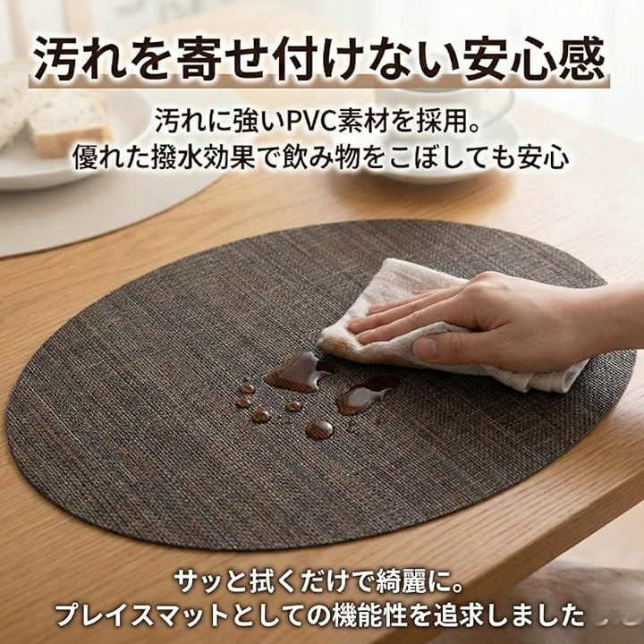 「高品質なPVC素材が叶える高い耐久性」 布製のようにシワやカビの心配がなく、長く愛用できる丈夫なPVC製のランチョンマットです。
