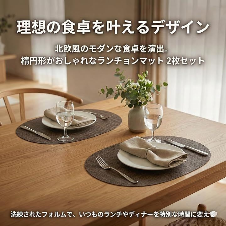 「北欧モダンな食卓を叶える洗練されたデザイン」 柔らかな曲線を描く楕円形のフォルムに、スタイリッシュな縦縞(ストライプ)模様を施した高級感あふれるプレイスマットです。