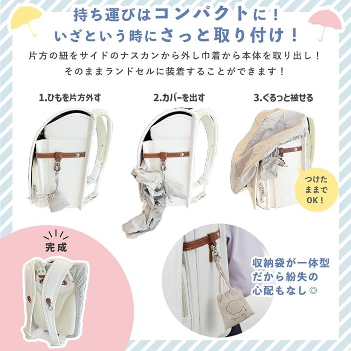「取り付け」(1)使用しないときはランドセルサイドについているナスカンにつけて持ち運び。巾着にはかわいい雲柄とhugmuuのロゴ入り。リフレクター機能付きで安心(2)使用時は片方の紐をサイドのナスカンからとり巾着から本体を取り出し。そのままランドセルに装着することができます。