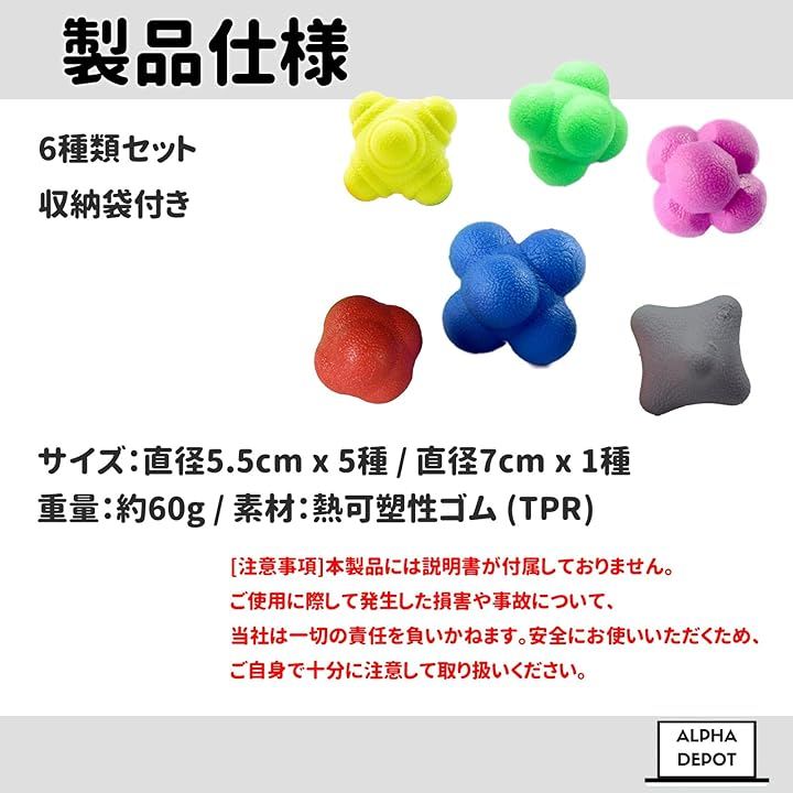 「商品詳細」リアクションボール6種セット・収納袋付き / サイズ:直径約5.5cm x 5種、直径約7cm x 1種 / 重量:約60g / 素材:熱可塑性ゴム (TPR) *ご利用のモニター環境などにより、実際の色味と異なって見える場合があります。