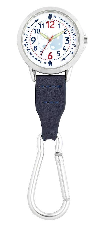文字盤サイドメモリで、20回の脈拍を取ることで約1分間の脈拍を簡易的に知ることができる目盛付きです。 カラビナが付くことで往診の際のバックに取り付けたり、ワゴンに取り付けたり、パンツのベルトホルダー等にも取り付けたりしやすくなります。 逆さ文字盤にしていますので、自分から見た際に、見やすくなっています。 暗闇で時間を知るのに、短針と長針針には蓄光針を使用しています。 【取り扱い注意事項】 クォーツ式は磁気帯びに弱く故障の原因の一つと考えられています。 磁気を発生する機器の近くで時計を使用している場合、磁気帯びが主な原因として考えられます。 パソコンやテレビ、電子レンジなど、家電製品の中には強い磁気を発するものがあります。 身近なものでは、スマートフォンなどもあり、これらが発する磁気が部品に影響を与え、 突然時間がづれる、止まるなどの原因になっている場合があります。 磁気帯びを防ぐためには下記に注意して下さい。 ・スマートフォンや関連商品と時計を一緒に置かない。 ・カバンの内ポケットには時計を入れない。 ・いろいろなモノといっしょに小物入れに保管しない。 保管場所に気を付けて大切に使いましょう。 時計が磁気を帯びた場合は、磁気抜き作業をしなければいけませんので、磁気を抜くための器具が必要になりますので、メーカーまたは、専門店へご相談下さい。 ガラス面がフラット仕様 文字盤サイズ 3cm 1年間保証書付 電池:SR626 時間精度:平均月差30秒 表示方法:アナログ 日常生活防水 (ケース)亜鉛合金、 (針)真鍮、 (風防)ミネラルガラス (裏蓋)ステンレススチール、 (文字盤)鉄