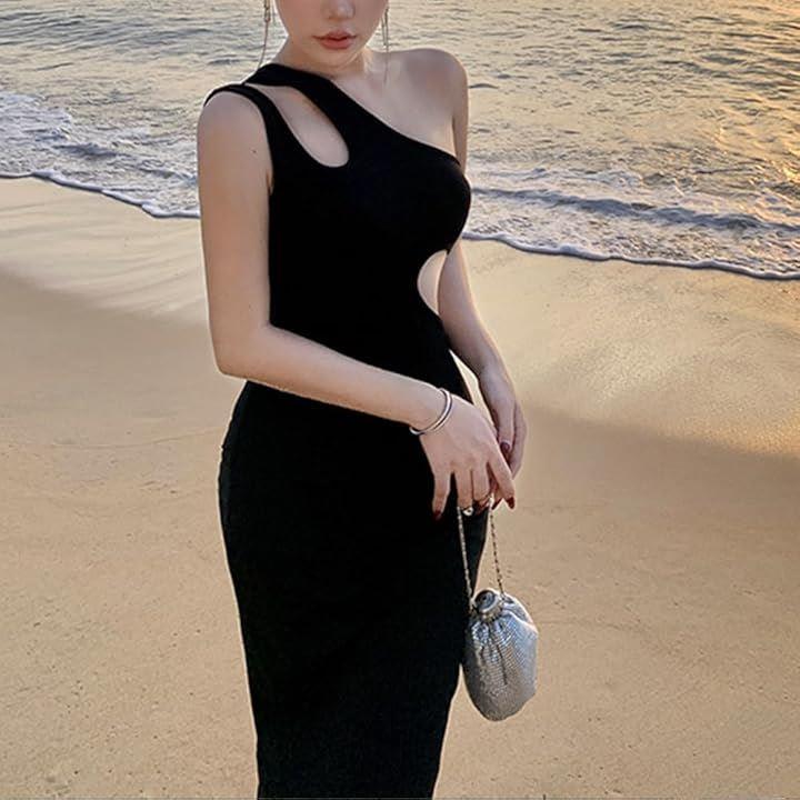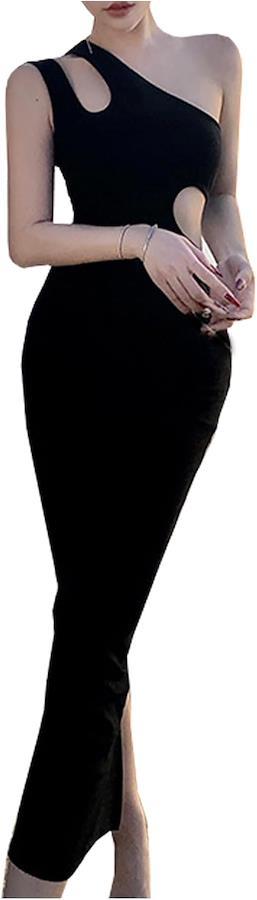 「洗練されたシルエット」シンプルながら個性的なワンショルダードレスで脇下に配したカット部分から透ける素肌がセクシーなブラックドレスです。
