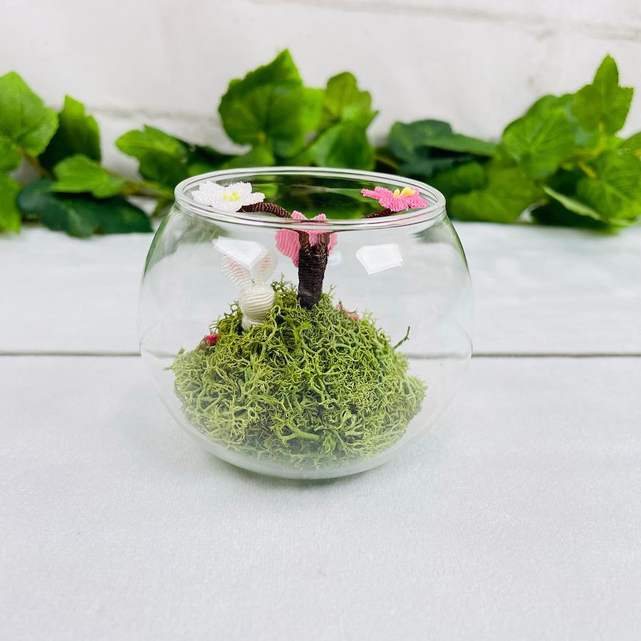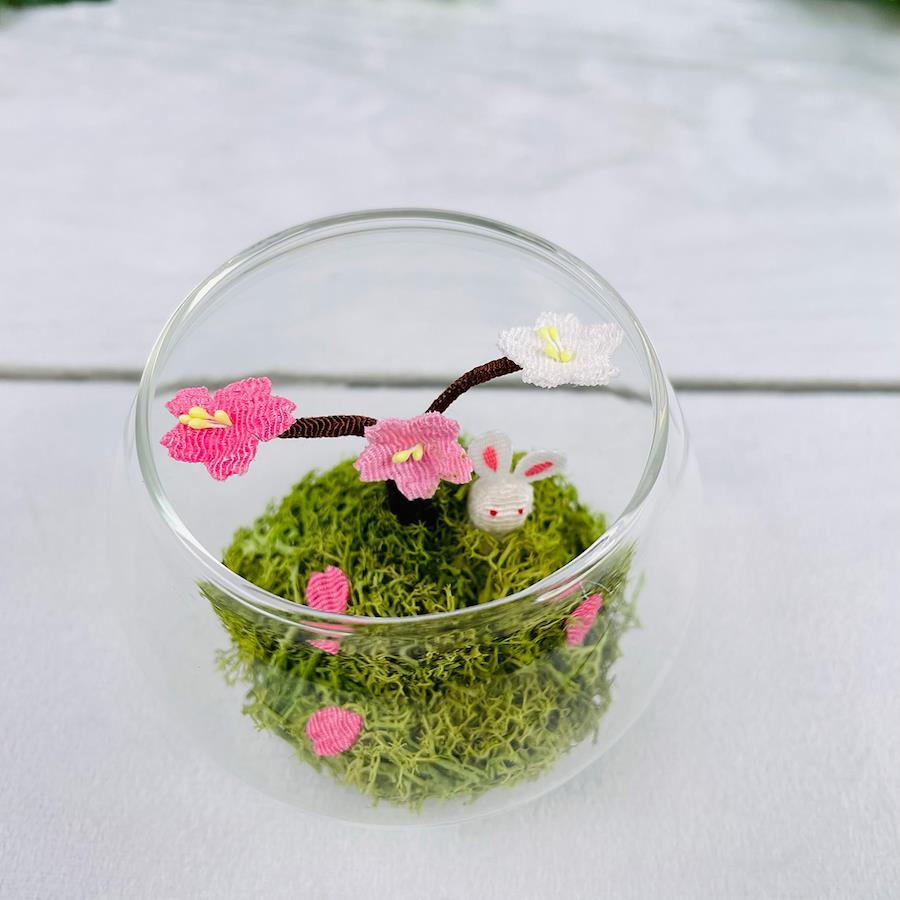 A charming terrarium-style ornament made with chirimen (crepe) fabric dolls and plants. Inside the container, a tiny garden is beautifully crafted from chirimen fabric. Simply placing it in your space brings a touch of seasonal charm.