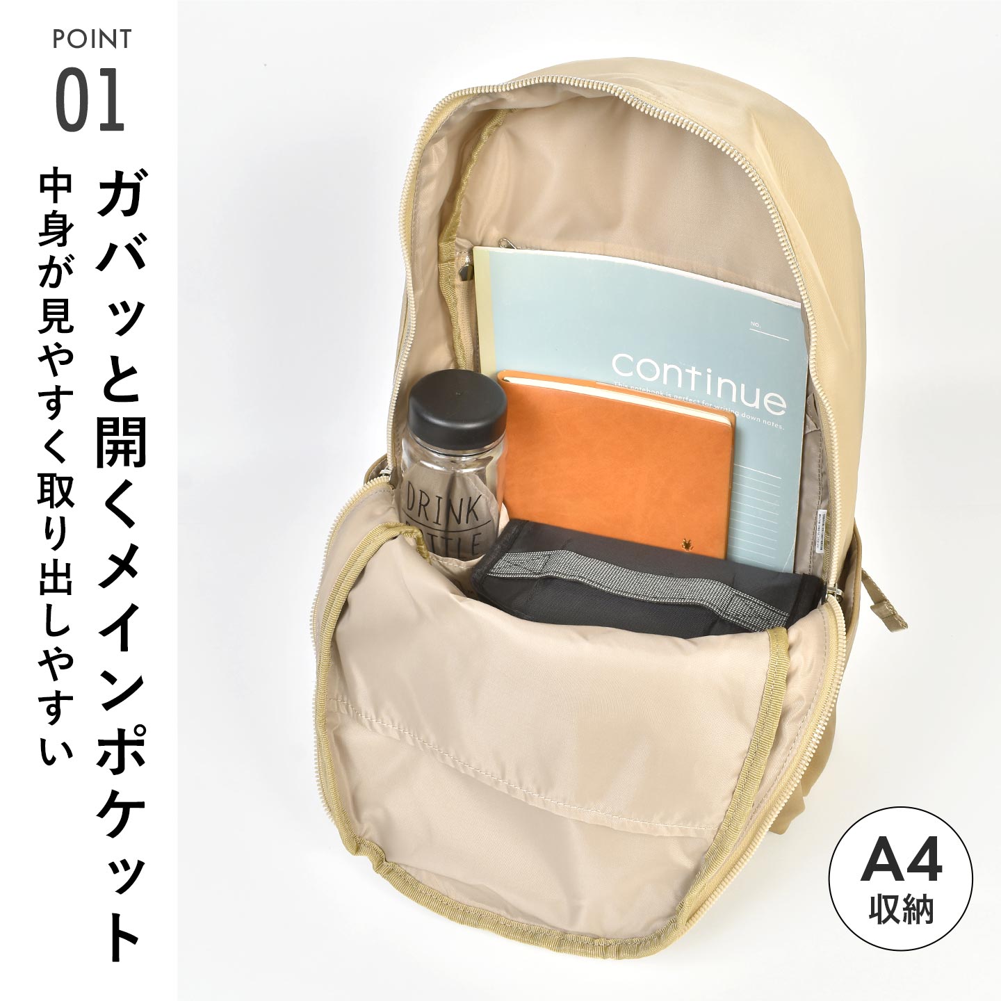 オールシーズン使える綺麗さ・カジュアルさを両立したデザインと豊富な10個のポケットが魅力のオールデイシリーズ。ナイロン部分、合皮部分共に撥水加工がされており、急な雨も安心でお手入れも簡単。セキュリティーポケットやボトルポケット、背負ったままものが取り出せるバックファスナーなど細かい機能性も◎シルエットはスリムながら、A4サイズがらくらく収納可能で通勤や通学などのデイリー使いに活躍してくれます。