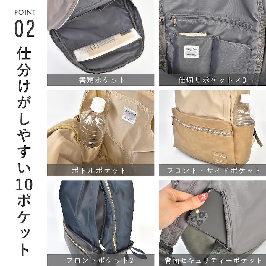 オールシーズン使える綺麗さ・カジュアルさを両立したデザインと豊富な10個のポケットが魅力のオールデイシリーズ。ナイロン部分、合皮部分共に撥水加工がされており、急な雨も安心でお手入れも簡単。セキュリティーポケットやボトルポケット、背負ったままものが取り出せるバックファスナーなど細かい機能性も◎シルエットはスリムながら、A4サイズがらくらく収納可能で通勤や通学などのデイリー使いに活躍してくれます。