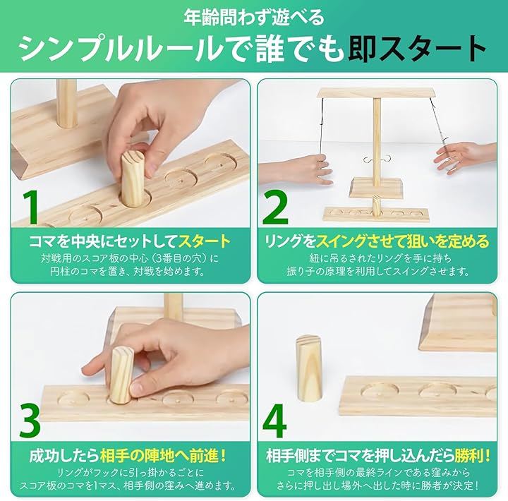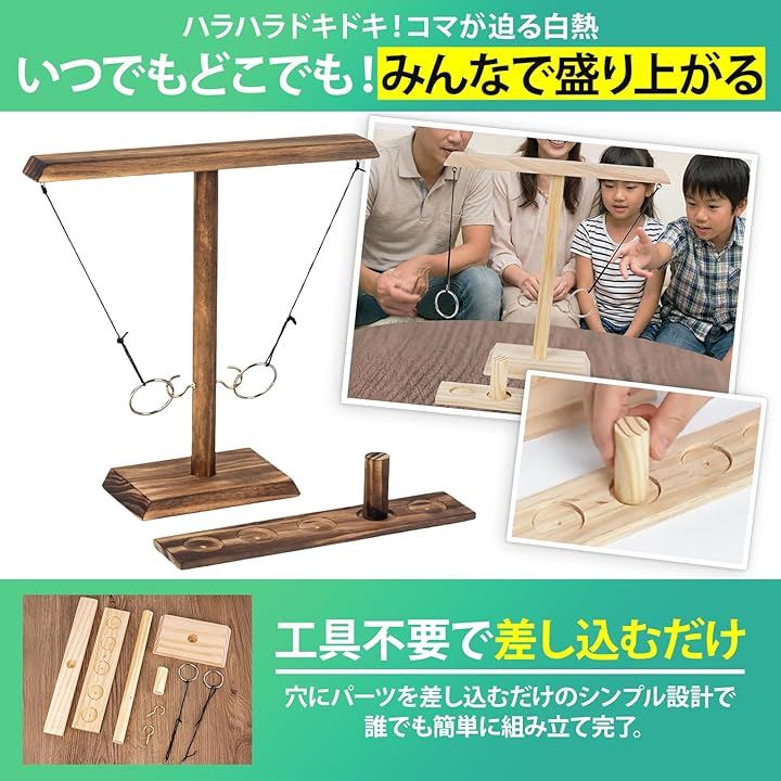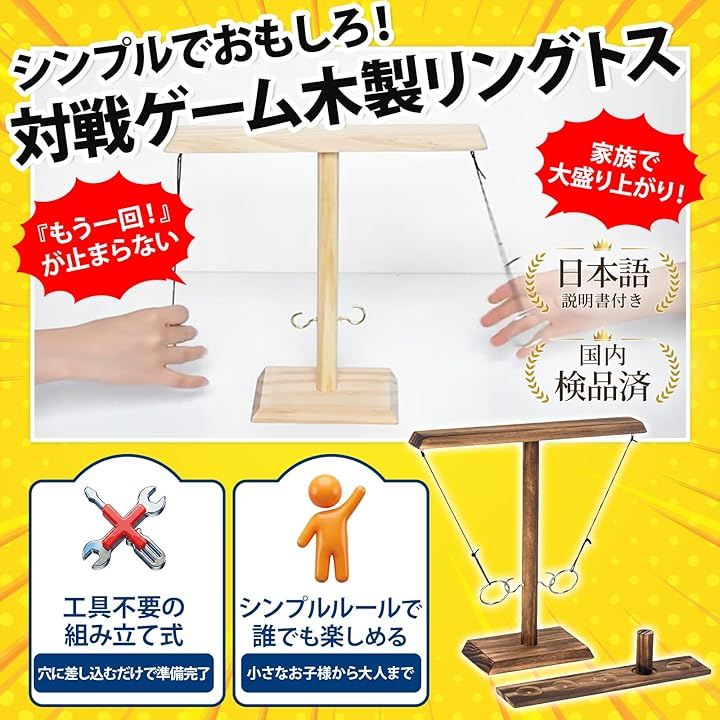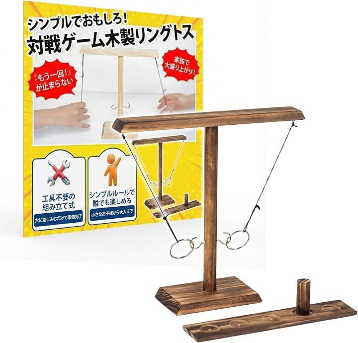 「卓上で白熱」輪投げ要素を活かしたテーブルゲーム構成により短時間でも白熱した対戦が可能で集まりや飲み会の余興として使いやすい、卓上サイズで準備片付けもスムーズに行えます。