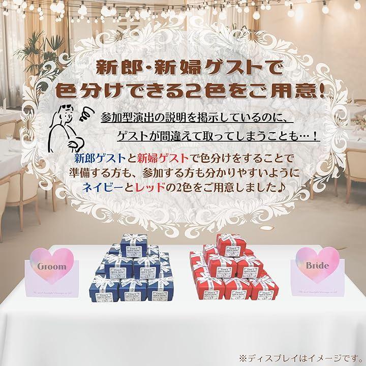 新郎・新婦のゲスト用にそれぞれ色分けができ、リボンも華やかなレッドとネイビーの2色セットです。