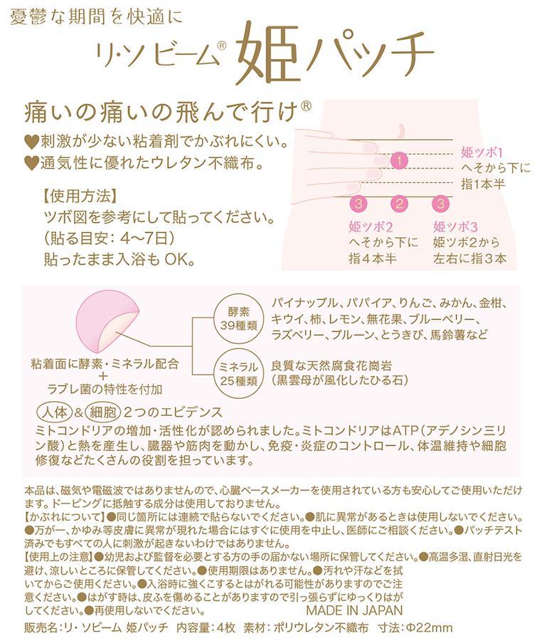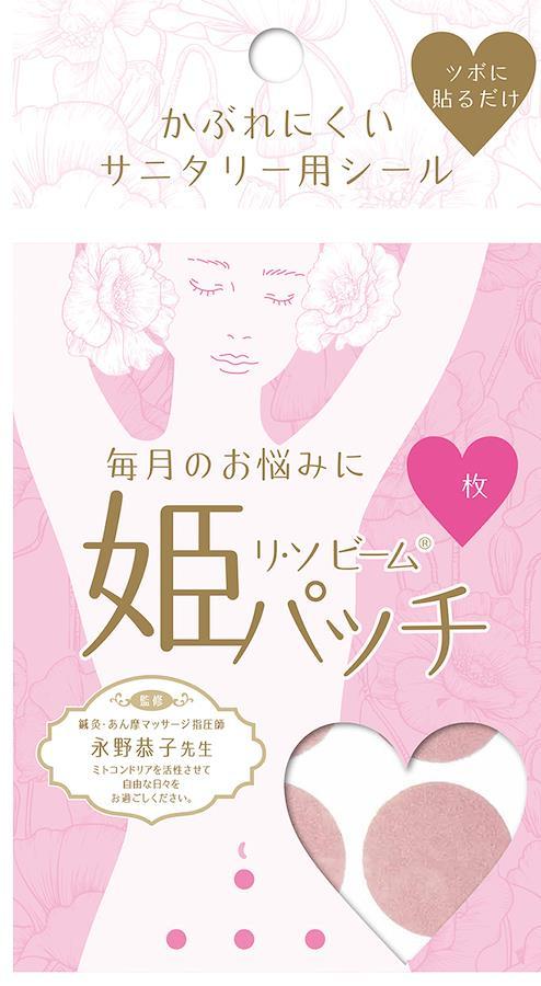 ★毎月、憂鬱な気分に悩まされ続けている女性に*女性の約70%は毎月の生理痛・生理不順などにより悩まされています。その悩みの素は生理痛による痛みをはじめ、かゆみやモレの心配、イライラや気分の落ち込み・集中力の低下(PMS)など人によって様々。これらの症状は心と体への影響だけではなく、日常生活に支障をきたすことも少なくありません。*リ・ソビーム姫パッチは「生理痛」「PMS:月経前症候群」を少しでも和らげたいと開発された商品です。粘着面に酵素・ミネラル配合。自分に状態に合ったツボに貼るだけで身体の調整、諸症状の緩和を図ります。痛み止めでは緩和することのできない精神的な症状にも効果的です。*姫パッチが生理痛を軽くする秘密は【ミトコンドリア】!生理中の大敵は「冷え」!姫パッチを貼った部分および周辺のミトコンドリアが増加・活性化することで糖質や脂質を燃焼し、エネルギーを生成することで体温維持や細胞修復などのたくさんの役割を担い、冷えから守ります。*お肌に優しい素材でできています。通気性に優れたウレタン不織布で、ムレにくい。刺激が少ない粘着剤でかぶれにくい。*つけていることを忘れるほどの軽い着用感です。貼る目安:4~7日貼ったまま入浴もOK。