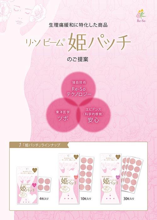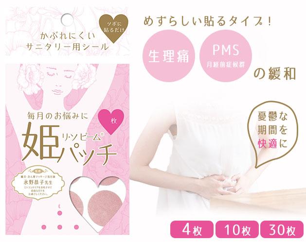 ★毎月、憂鬱な気分に悩まされ続けている女性に*女性の約70%は毎月の生理痛・生理不順などにより悩まされています。その悩みの素は生理痛による痛みをはじめ、かゆみやモレの心配、イライラや気分の落ち込み・集中力の低下(PMS)など人によって様々。これらの症状は心と体への影響だけではなく、日常生活に支障をきたすことも少なくありません。*リ・ソビーム姫パッチは「生理痛」「PMS:月経前症候群」を少しでも和らげたいと開発された商品です。粘着面に酵素・ミネラル配合。自分に状態に合ったツボに貼るだけで身体の調整、諸症状の緩和を図ります。痛み止めでは緩和することのできない精神的な症状にも効果的です。*姫パッチが生理痛を軽くする秘密は【ミトコンドリア】!生理中の大敵は「冷え」!姫パッチを貼った部分および周辺のミトコンドリアが増加・活性化することで糖質や脂質を燃焼し、エネルギーを生成することで体温維持や細胞修復などのたくさんの役割を担い、冷えから守ります。*お肌に優しい素材でできています。通気性に優れたウレタン不織布で、ムレにくい。刺激が少ない粘着剤でかぶれにくい。*つけていることを忘れるほどの軽い着用感です。貼る目安:4~7日貼ったまま入浴もOK。