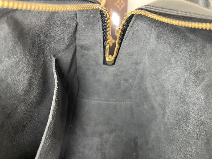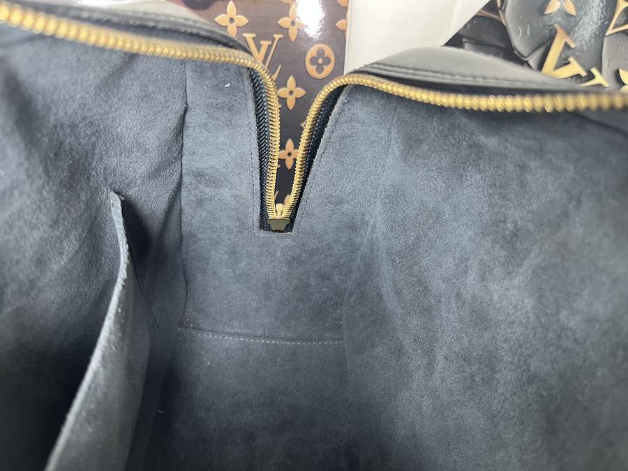・バッグ正面中央やや左側に革ダメージあり(補修・補色済み)・バッグ角や底部分の軽度な擦れに対し、黒の革用クリームで補色メンテナンス済み・全体として大きく目立つ傷や破れはなく、エピレザーの質感も良好・型崩れはほとんどなく、フォルムはしっかり保たれています
