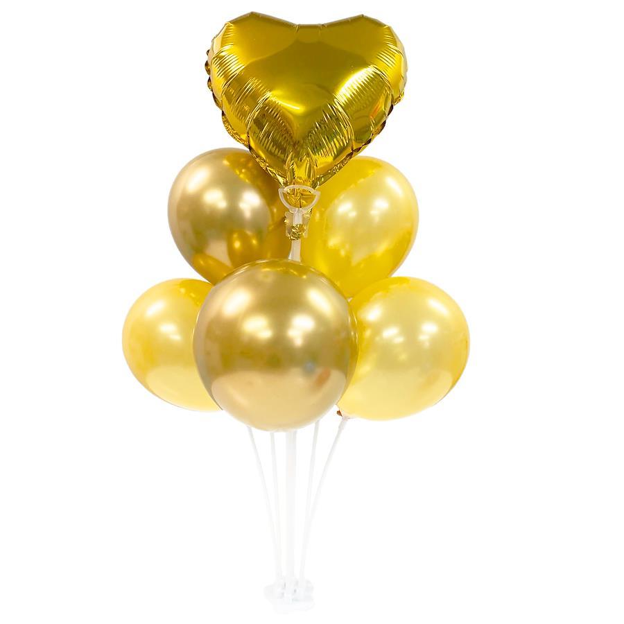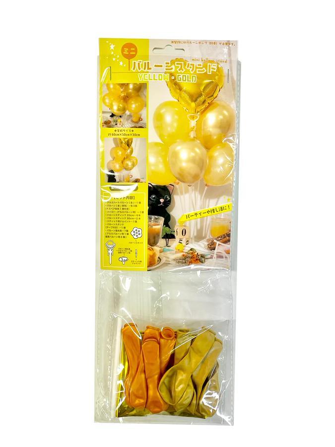誕生日会や結婚式、推し活(推し不在、本人不在の誕生日会)などのイベント・パーティーに大活躍★卓上式のミニバルーンスタンドです。【製作時間】約10分【完成サイズ】約60㎝×30㎝×30㎝【セット内容】アルミハートバルーン(金)×1個/ゴムバルーン(金/黄色)×8個(各色3個+各色予備1個 )/バルーンスタンド×1個(粘着シール付)/スティック 30cm×2個・スティック20cm×6個/スティック用ジョイント×1個/アルミバルーン用吹込みストロー×1個/バルーン留め具×7個(アルミバルーン用×1・ゴムバルーン用×6)※製作にはバルーンポンプ(別売)が必要です。【保管方法】直射日光や高温を避けて保管してください。【膨らました後の飾る場所について】日光・風の当たる場所を避けてください。日光の当たらない屋内で製作し飾ってください。【免責事項】メーカーによる商品リニューアルに伴いパッケージ(内容量も含む)変更が行われた場合、新パッケージでお届け致します事ご了承願います。