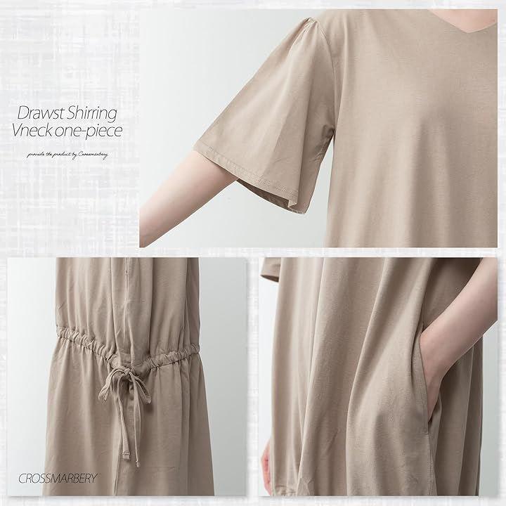 女性らしい抜け感を生み出すドロストシャーリング Vネックワンピース Vネックのデザインがデコルテラインを美しく見せ、程良い抜け感と女性らしさを引き立てます。