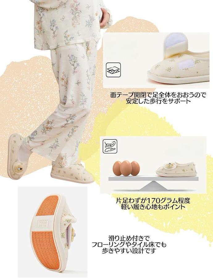 「見た目のやさしさと機能性の両立」このルームシューズは、見た目の可愛さだけでなく、実用性にもこだわったアイテムです。