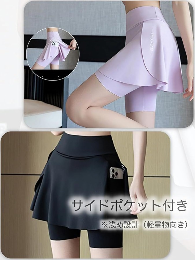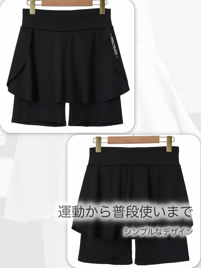 レギンスをベースにスカートを組み合わせた構造で、動きやすさを保ちながらヒップ周りを自然にカバーします。