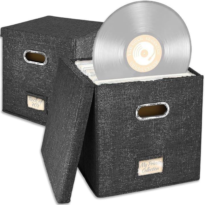 「商品詳細」 折りたたみ式レコード収納ボックス(フタ付き) カラー:グレー/ブラック サイズ:縦33cm 横33cm 高さ33cm 素材:コットンリネン調生地(内側:不織布)
