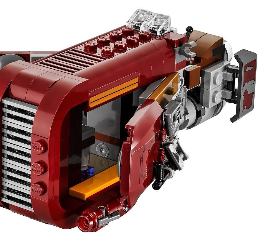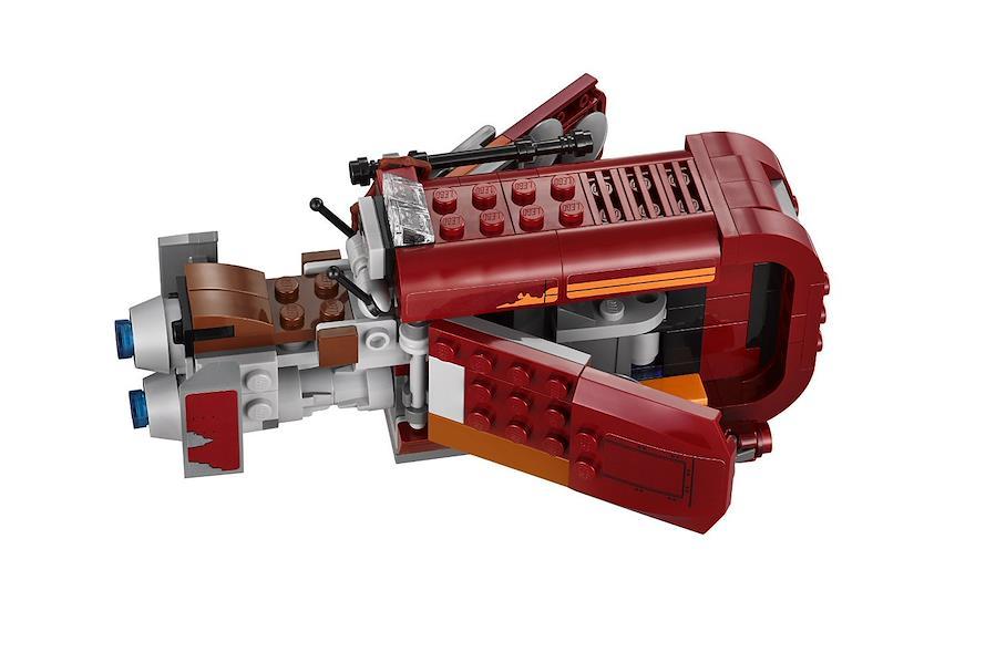 レイのスピーダーに乗っていざ出発!デュアル・スタッドシューターから開閉式の収納ハッチ、横にぶら下げた鞄、ブラスター、バズソー、電子双眼鏡まで、砂漠の星を偵察するレイに必要な道具すべてがそろっているぞ。ピンチの時はミニフィギュアを乗せることができる分離ソリで脱出だ!『スター・ウォーズ / フォースの覚醒』からお気に入りのシーンを再現して楽しもう。