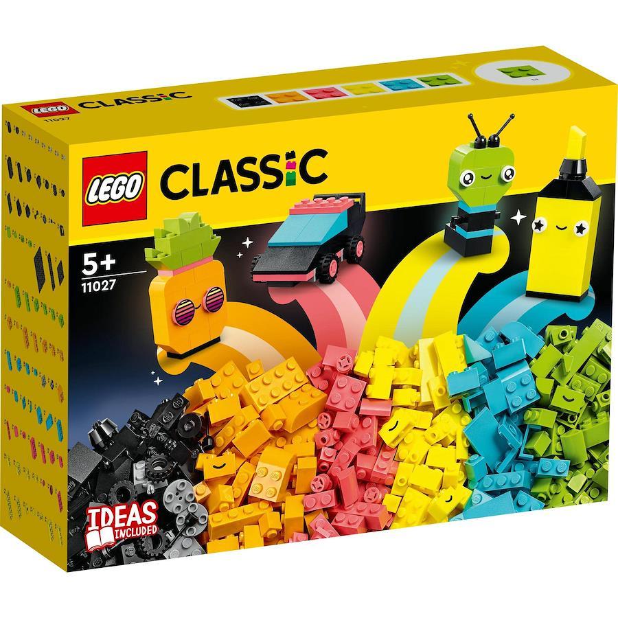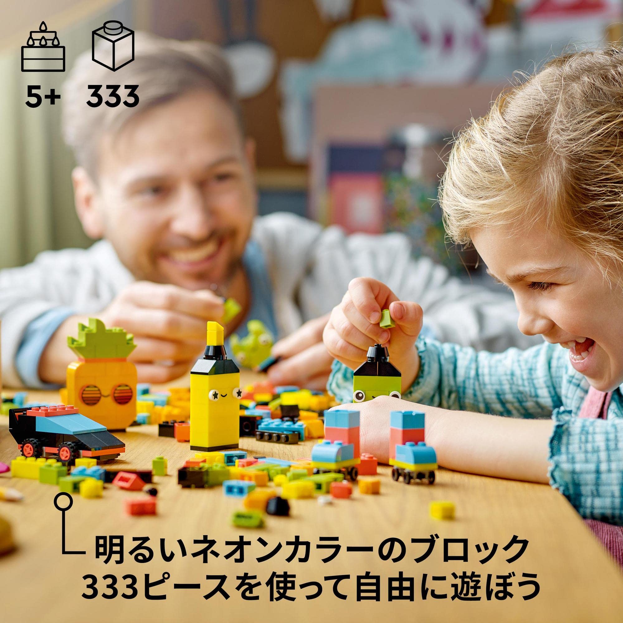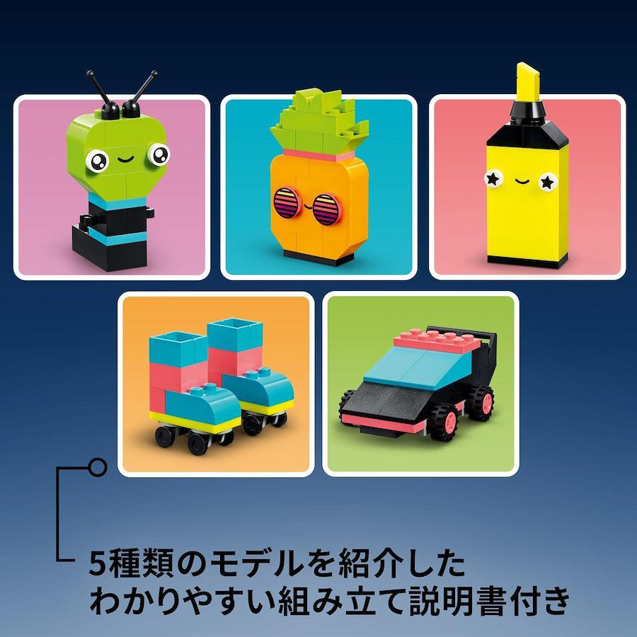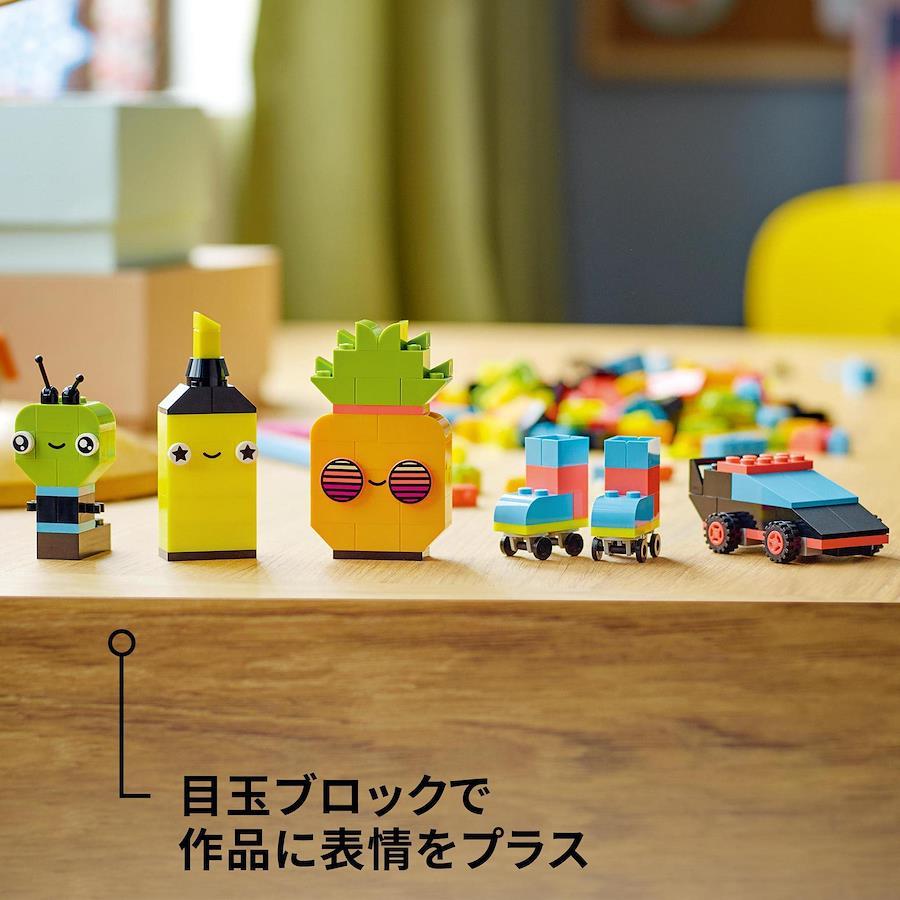 お子さまが目を輝かせてよろこぶネオンカラーの楽しいブロックセット。まずは、簡単に組み立てられる5種類のモデル(パイナップル・蛍光ペン・車・エイリアン・ローラースケート)から始めてみましょう。完成したモデルに目玉ブロック18個を足せば、さらに楽しく個性的な作品が出来上がります。