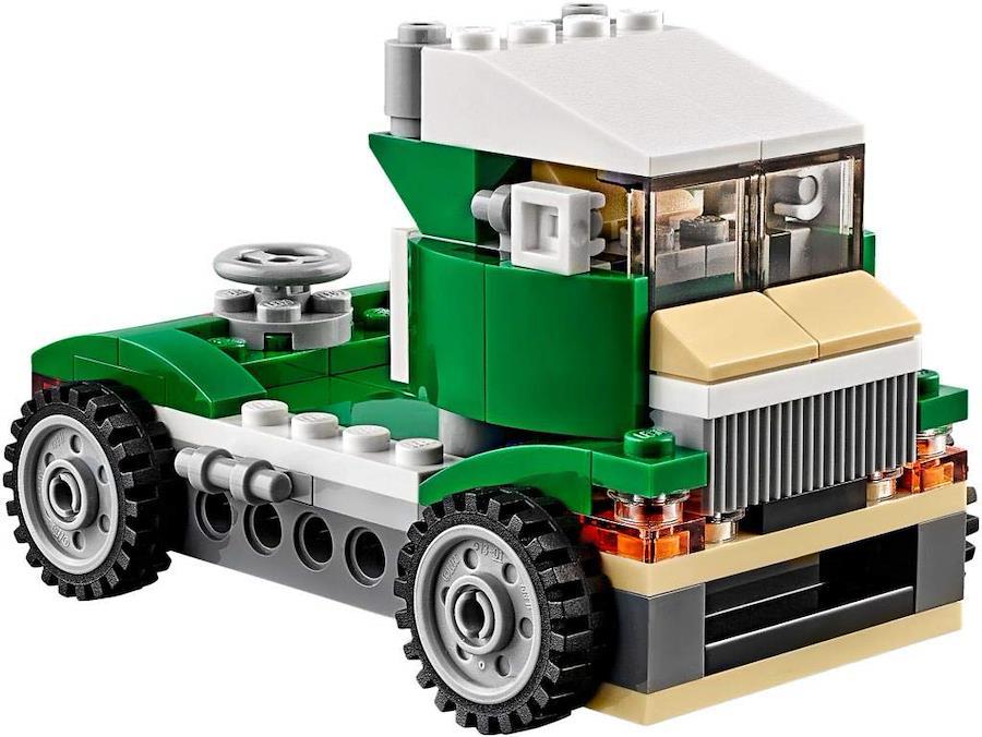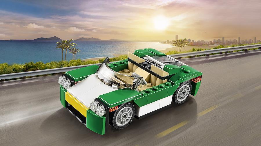スタイリッシュな緑のオープンカーで太陽の光をいっぱいに浴びよう! 鮮やかな緑と白、黄色、黒のボディには色つきのフロントガラスがついていて、ミニフィギュア2体が乗れる広い座席には本物そっくりのダッシュボードやハンドルもついているよ。座席の前にあるトランクを開けると中には荷物を入れるスペースがあって、後ろの透明フードを開けるとエンジンが見れるぞ。スピードボートや丈夫なトラックに変身させてみてね。
