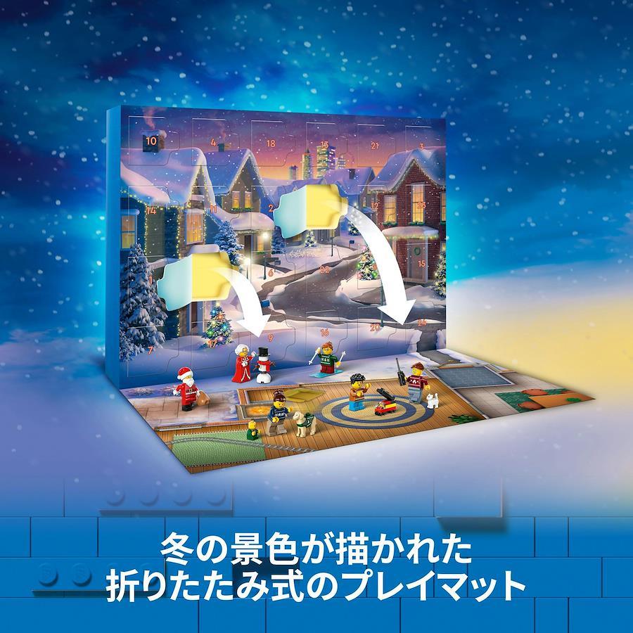 お楽しみが詰まったアドベント・カレンダー - クリスマスまでのカウントダウンを盛り上げよう(対象年齢:5才以上)24日間のサプライズ - サンタクロースとミセス・クロースのミニフィギュア、クリスマスセーターを着たキャラクター、ミニモデル、コレクターズアイテムが含まれていますプレイマット付き - カレンダーの箱を広げると冬の町をイメージしたプレイマットになり、ミニフィギュアやミニモデルを使ったごっこ遊びの背景として役立ちますクリスマスらしい各種アイテム - ひと目でわかる組み立て説明がドアの裏に印刷され、レゴ初心者でも安心してお楽しみいただけますクリスマス前のプチギフト - 5才以上のお子さまやクリスマスを愛してやまないレゴファンへの贈りものにぴったりです限界突破の創造力 - レゴシティ シリーズのセット(別売)を組み合わせれば、楽しい冒険の世界が無限大に広がりますレゴシティで遊ぼう - レゴシティシリーズは、リアルな建物や乗りものとキャラクターたちが、お子さまの尽きない想像力を引き出し、組み立て遊びを通じて創造と探究の楽しさを伝えますが好きな 4歳 5歳 6歳 男の子 女の子 向けのおもちゃ【免責事項】メーカーによる商品リニューアルに伴いパッケージ(内容量も含む)変更が行われた場合、新パッケージでお届け致します事ご了承願います。