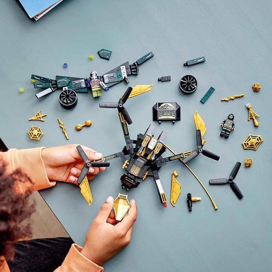 2体のミニフィグ(スパイダーマン、ヴァルチャー)、4つのローターや2台のスタッドシューターを搭載したクアッドローンの組み立てセットです。