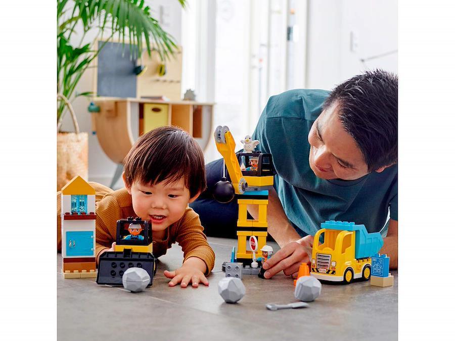 小さなお子さまと一緒にレッキング・ボールを左右に動かして建物を壊したら、ブルドーザーで更地にして、新しい建築資材をトラックで運びこみます。レッキング・ボールの解体工事で自由に遊びながら、手先の動きをコントロールする力が身につき、想像力や創造性を育むことができます。