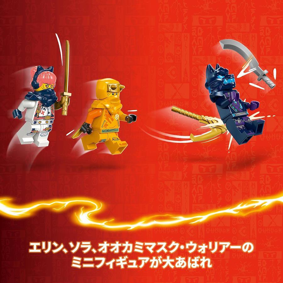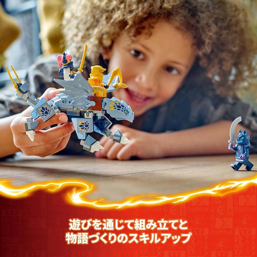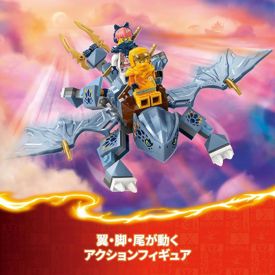アクション炸裂 - 『ニンジャゴー ドラゴンライジング』シーズン2で見たバトルアクションを再現できます(対象年齢:6才以上)ドラゴンのアクションフィギュア - ドラゴンの翼や脚、尾を動かしてポーズを変えられます。背中に取り付けたサドルにミニフィギュアをのせて空中バトルごっこを楽しめますミニフィギュア3体 - フックと剣で武装したエリンのほか、ソラとオオカミマスク・ウォリアーにも剣のアクセサリーが付属していますニンジャがテーマのギフト - 組み立てとごっこ遊びを満喫できる本セットは、ニンジャごっこに夢中なお子さまへのサプライズギフトにぴったりです頼もしい助っ人 - 手順がひと目でわかり、お子さまの新しいライフスキルの習得に役立つLEGO Builderアプリ。3D表示されたモデルをズームや回転させながら組み立て、作業途中の状態で保存していつでも再開できます冒険の舞台を広げよう - レゴニンジャゴーシリーズには、ドラゴンやメカスーツ、のりもので遊べるセット(各セット別売)が揃っていますニンジャになりきって遊べるおもちゃ - レゴニンジャゴーシリーズのメカスーツ、のりもの、道場があれば、壮大な冒険世界でニンジャごっこを楽しめますサイズ - (約)高さ6cm x 長さ19cm x 幅18cm/ピース数:132が好きな 5歳 6歳 7歳 8歳 小学生 男の子 女の子 向けのおもちゃ