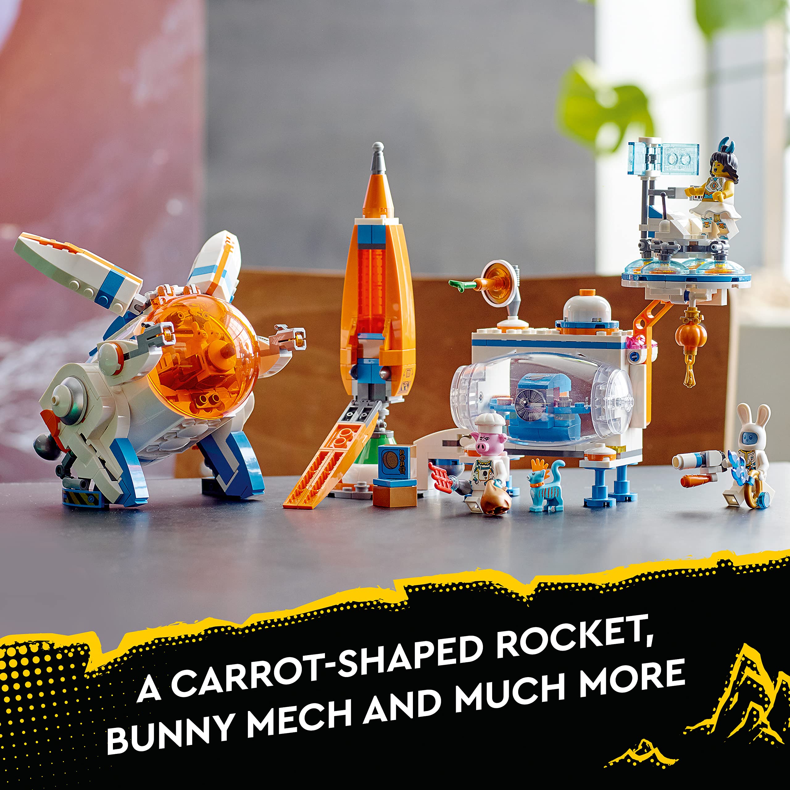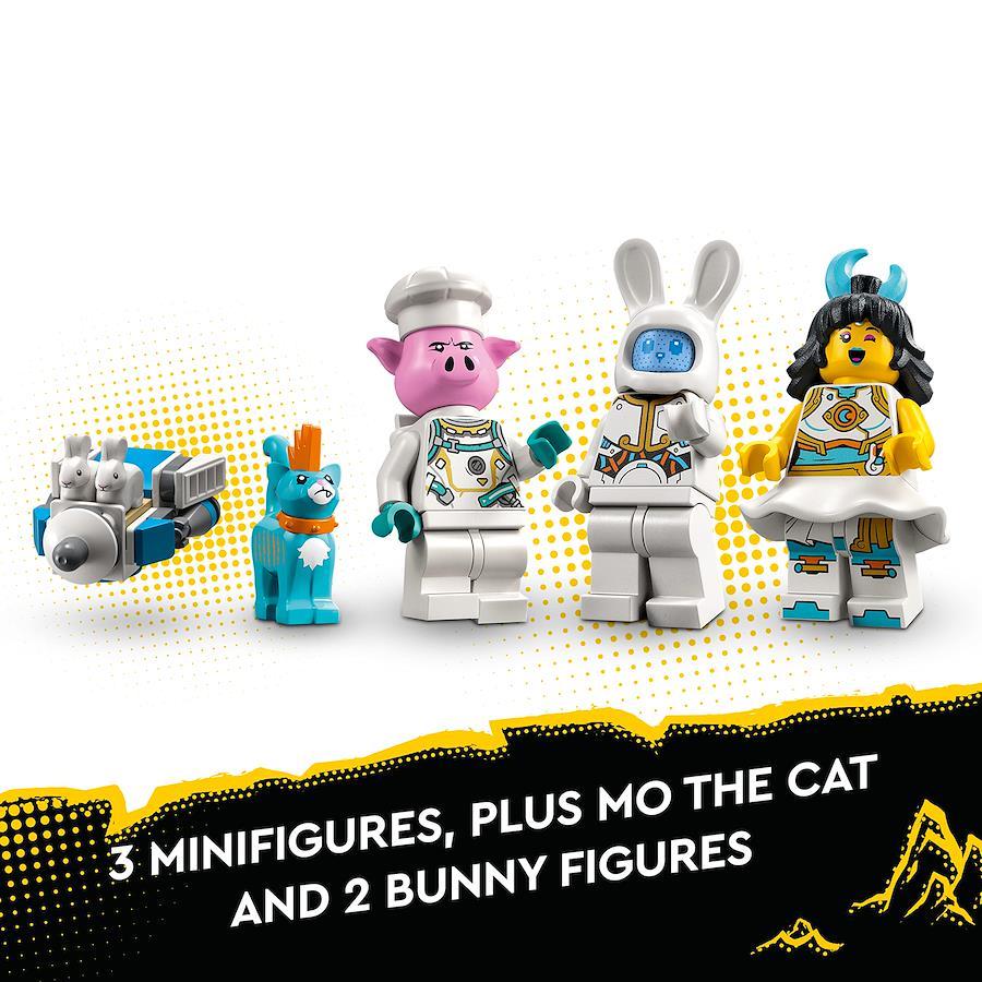 レゴミニフィギュア3体 - チャン、月のウサギロボットとニンジン型の銃、宇宙服姿で青い火炎輪と熊手を持つピグシー、ネコのモー、ウサギ2体が付属