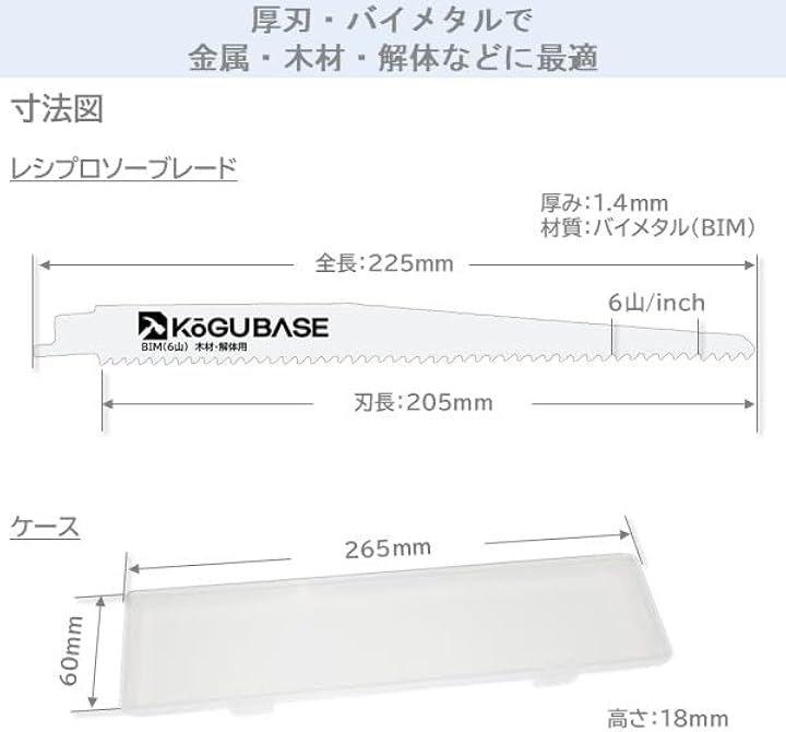 「商品概要」 (1)厚刃なので、内装解体等の作業に最適です (2)225mmの長めの替刃で、太いパイプなどの切断も可能です (3)バイメタル素材で、釘入り木材、金属も切断可能です (4)木材(釘可)やALCの切断、木材解体等に適しています (5)ボッシュ、マキタ、日立工機、リョービ、アサダ、MCCなど現在市販のほぼすべてのセーバーソー、レシプロソーの機種に装着可能です 「商品仕様」 ・サイズ:全長225mm/刃長205mm/刃厚1.4mm/山数6 ・重さ:約 28 g ・色 :ホワイト ・内容:レシプロソーブレード 全長225mm刃厚1.4mm6Tx6本 ・素材:バイメタル