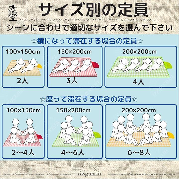 「製品サイズ」 100x150cm(2~4人用) 150x200cm(4~6人用) 200x200cm(6~8人用)