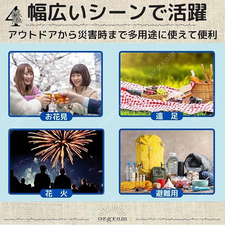 「幅広いシーンで利用できます」 ピクニックや遠足、花火大会、お花見はもちろん、防災グッズとしてもアウトドアから災害時まで幅広く活用できます。