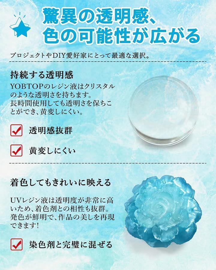 「高品質原料 & 低刺激性」YOBTOPは長年の樹脂生産の経験を持っており、レジンは環境に優しい原料を使用しております、無毒でVOCを含まず、低刺激性で作業中の不快感を大幅軽減。
