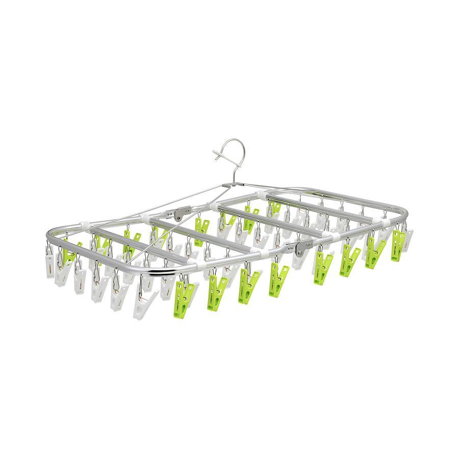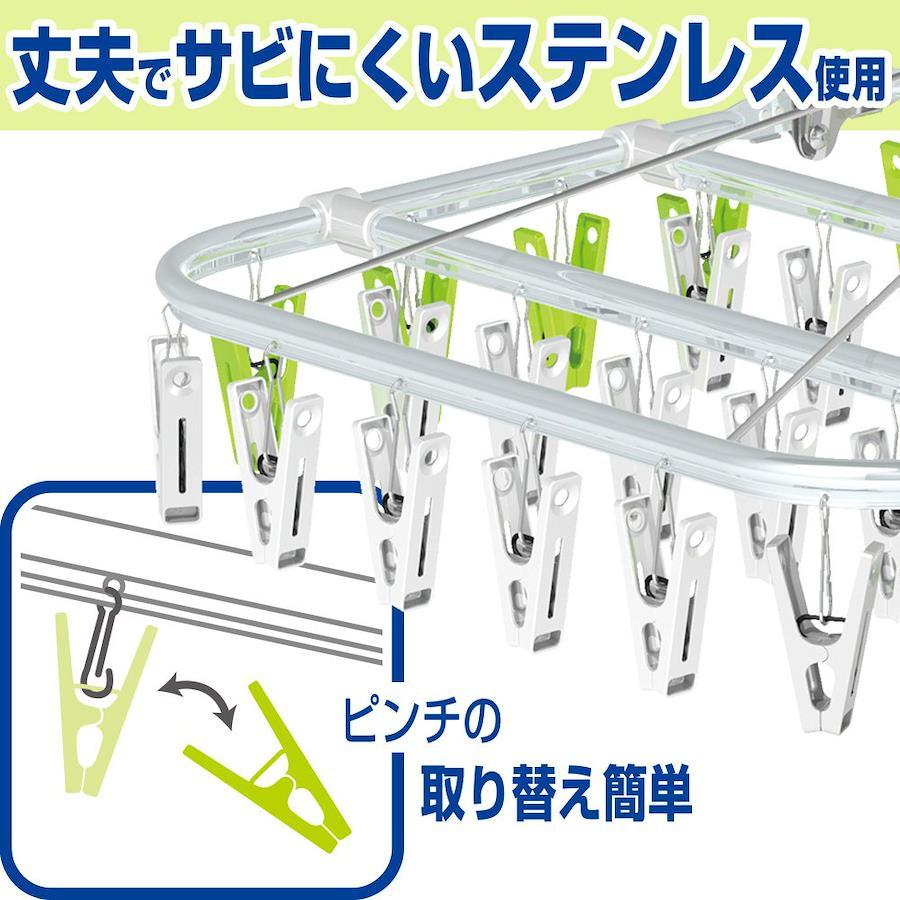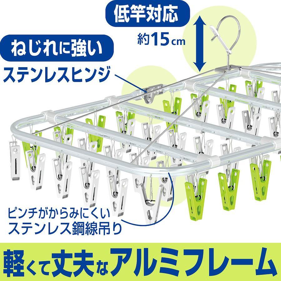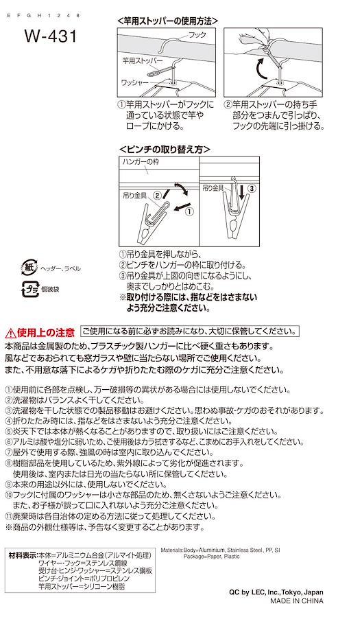 材質 本体=アルミニウム合金(アルマイト処理)、ワイヤー・フック=ステンレス鋼線、受け台・ヒンジ・ワッシャー=ステンレス鋼板、ピンチ・ジョイント=ポリプロピレン、竿ストッパー=シリコーン樹脂