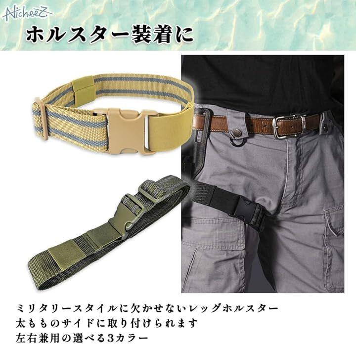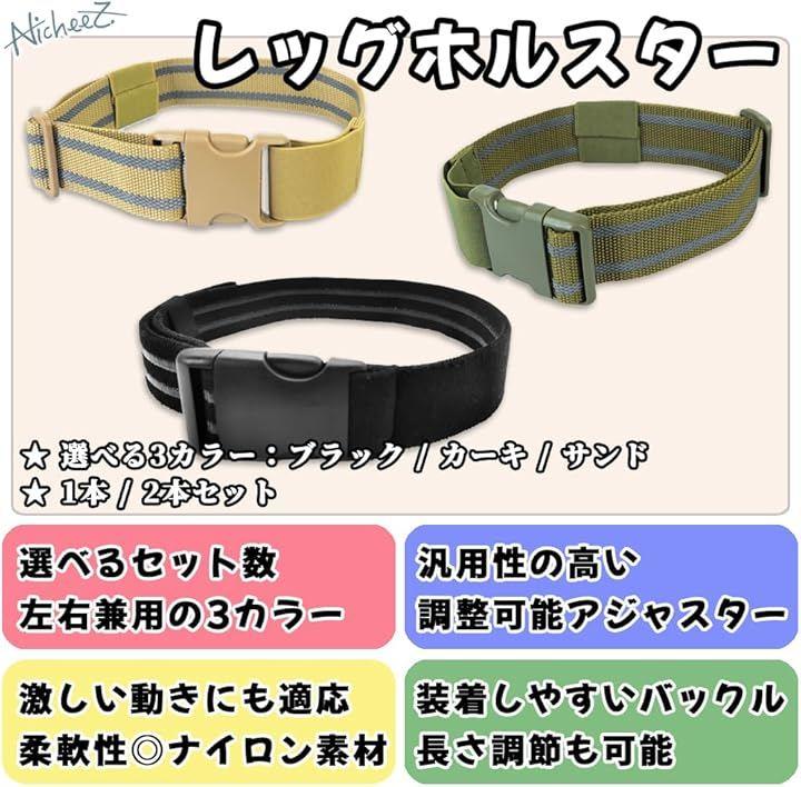 「商品内容」レッグホルスター(1本/2本セット) 材質:ナイロン カラー:ブラック/サンド/カーキ サイズ:長さ/約68cm 幅/約3.7cm 腿囲約58cmまで対応
