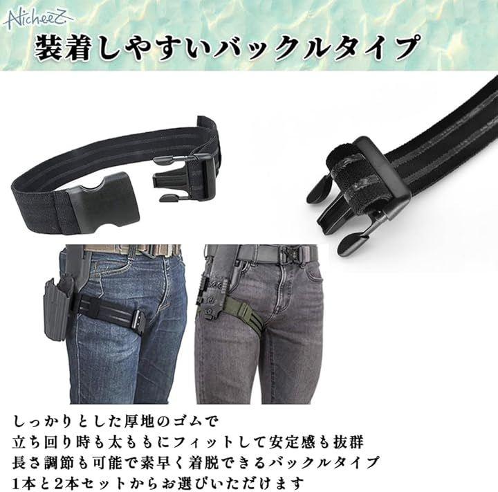 「装着しやすいバックルタイプ」しっかりとした厚地のゴムで立ち回り時も太ももにフィットして安定感も抜群です。