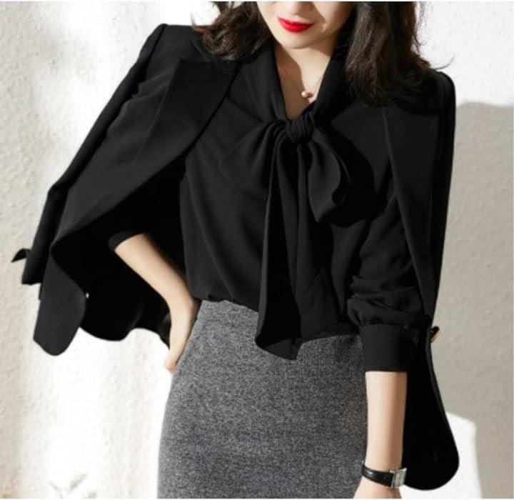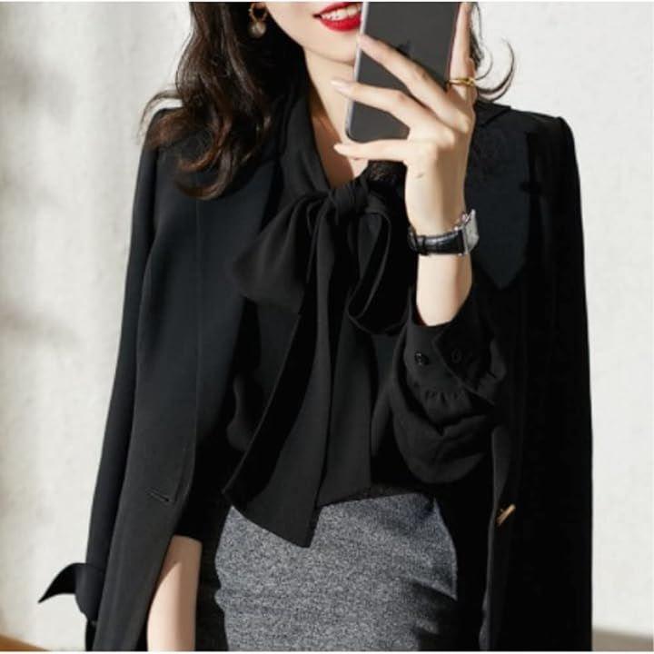 上品で大人可愛い、フォーマルでもカジュアルでも使える、キレイめ長袖リボンのブラウスシャツ。