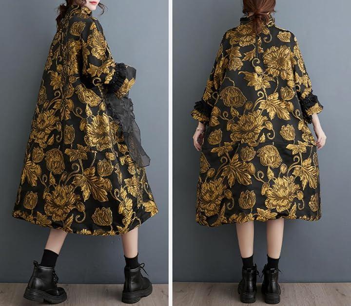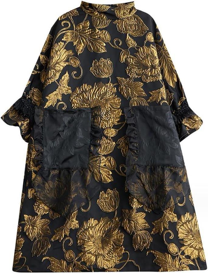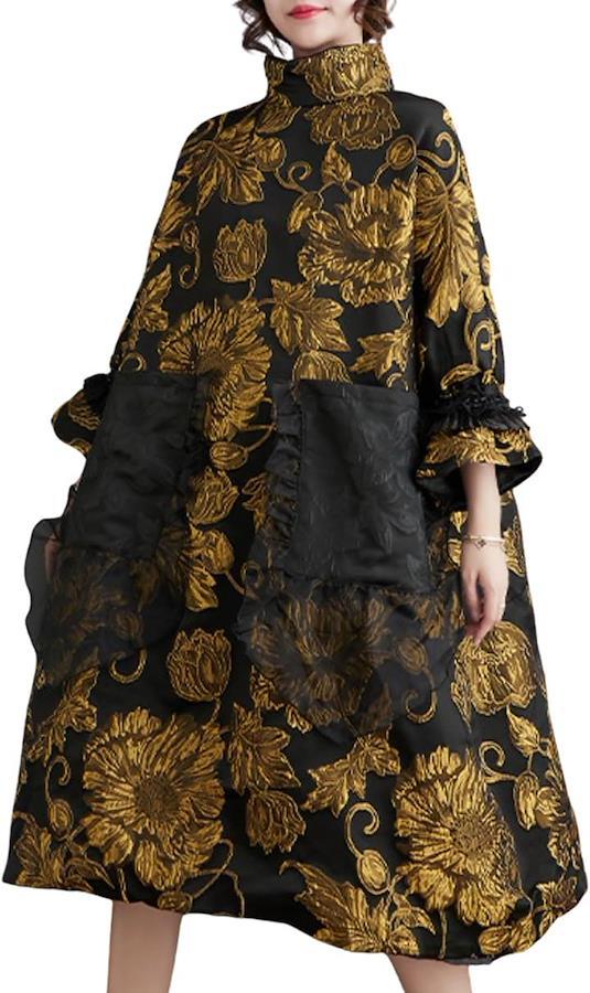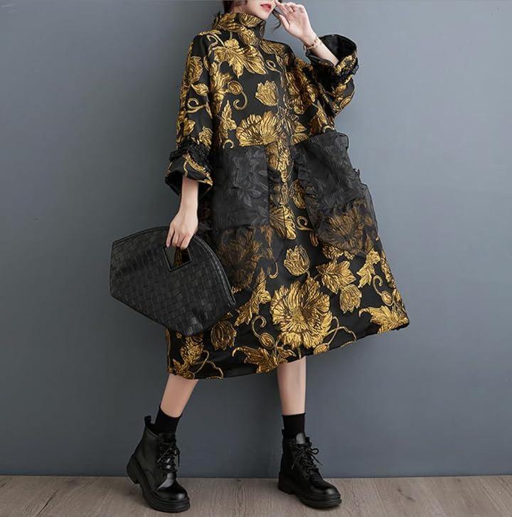 モード系 7分袖 ハイネック ジャガード ワンピース 金 刺繍 ひざ丈 黒 ブラック 長袖 衣装 変形 体型カバー 妊婦 マタニティワンピ 産前 産後 ロック 原宿 韓国 女装 コスプレ 可愛い 服 大きいサイズ かっこいい おしゃれ