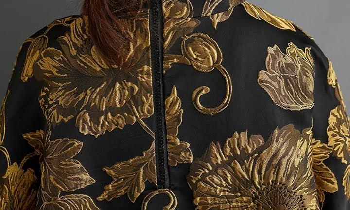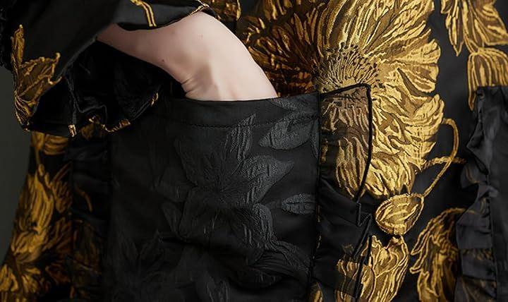 「こだわりのデザイン」上品な黒生地に大柄の金色の花をプリントしたジャガード風ワンピースです。