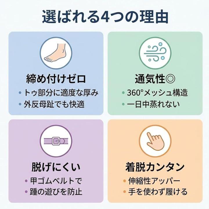 甲部分には伸縮性のあるゴムストラップを採用しており、足に合わせてフィットしながら脱ぎ履きがしやすい設計です。