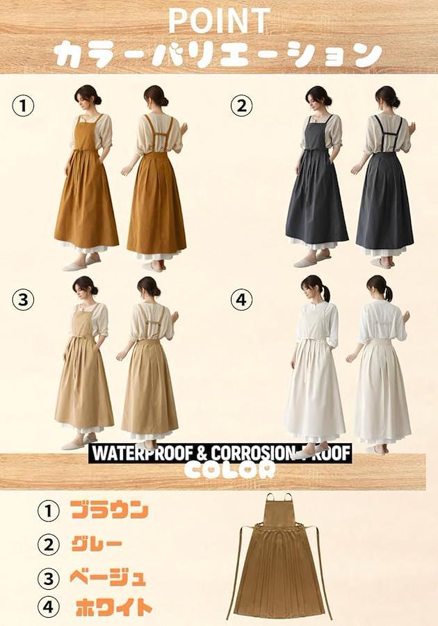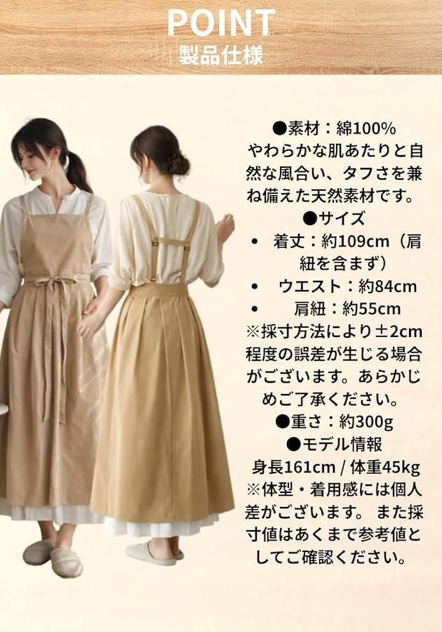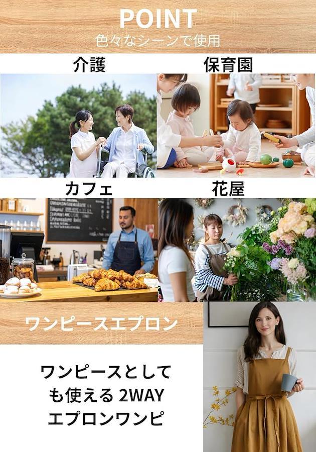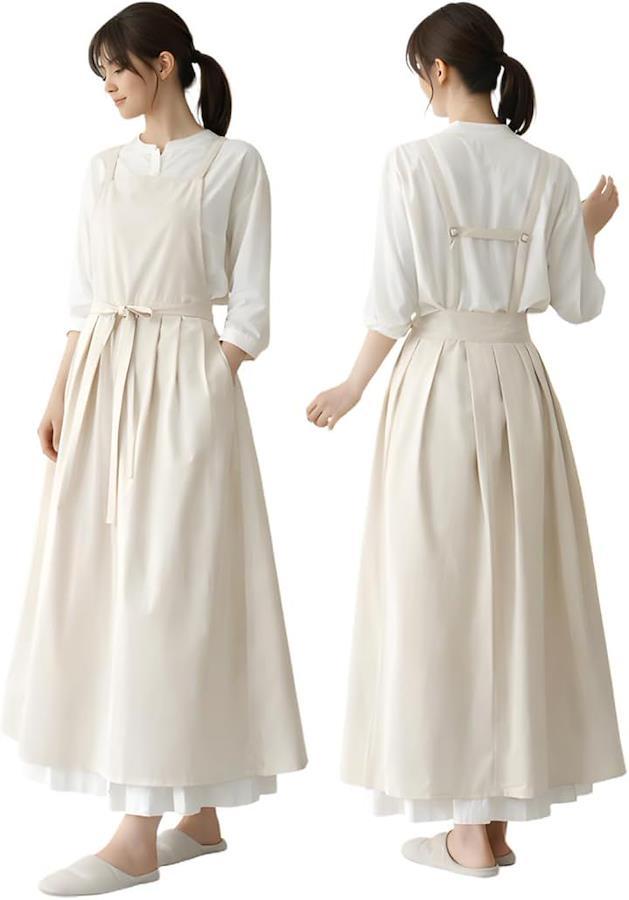 前後どちらから見ても美しく、エプロンに見えないワンピース感覚で着用できます。