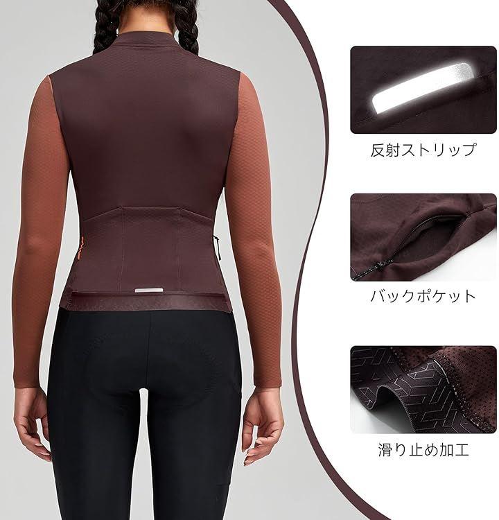 前傾姿勢や腕を前に伸ばす自転車を考慮し、背中を長くなって、肩周りをストレッチに作られています。