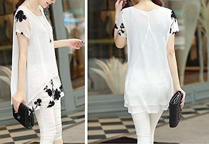 Women's simple layered floral see-through tunic layered look short sleeve frill top tiered cuff sleeve chiffon flounce ruffle straight flower hanagare embroidery russell lace round neck