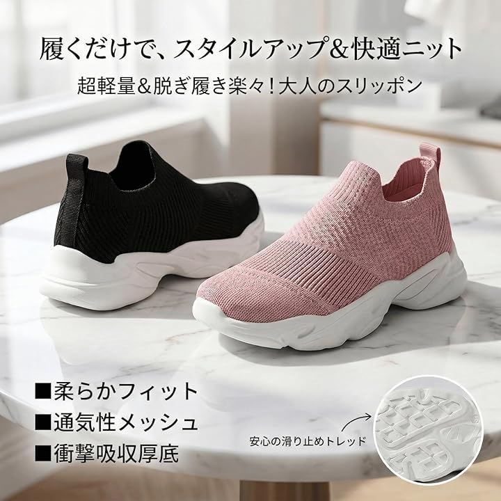 この靴は、通気性に優れたメッシュ素材を使用しており、足が蒸れにくく、一日中快適に過ごせます