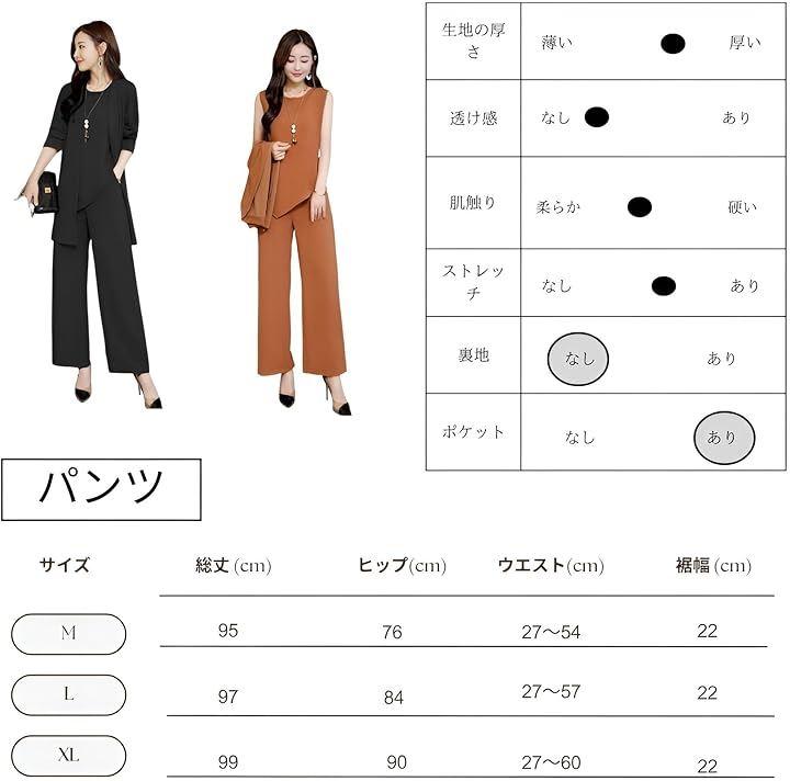 《パンツ》M:総丈95cm/ヒップ76cm/ウエスト27~54cm/裾幅22cm L:総丈97cm/ヒップ84cm/ウエスト27~57cm/裾幅22cm XL:総丈99cm/ヒップ90cm/ウエスト27~60cm/裾幅22cm *写真画面上のサイズをご確認ください。